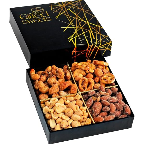 Included in this deluxe mixed nut box, a bundle pack of Healthy Snacks: Cinnamon Cashews, Smoked Almonds, Sweet Savory Bar Mix, and Roasted Salted Peanuts.